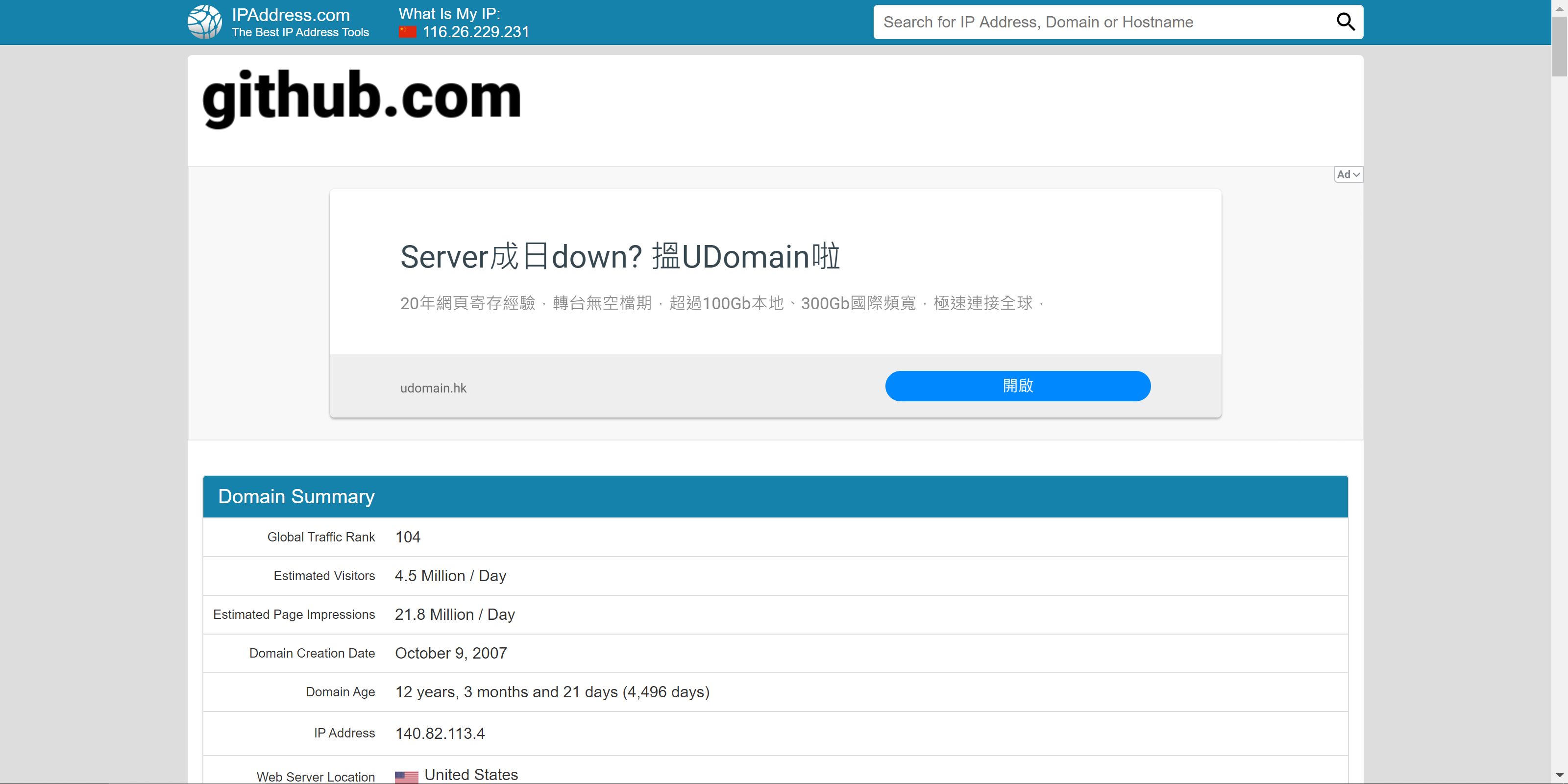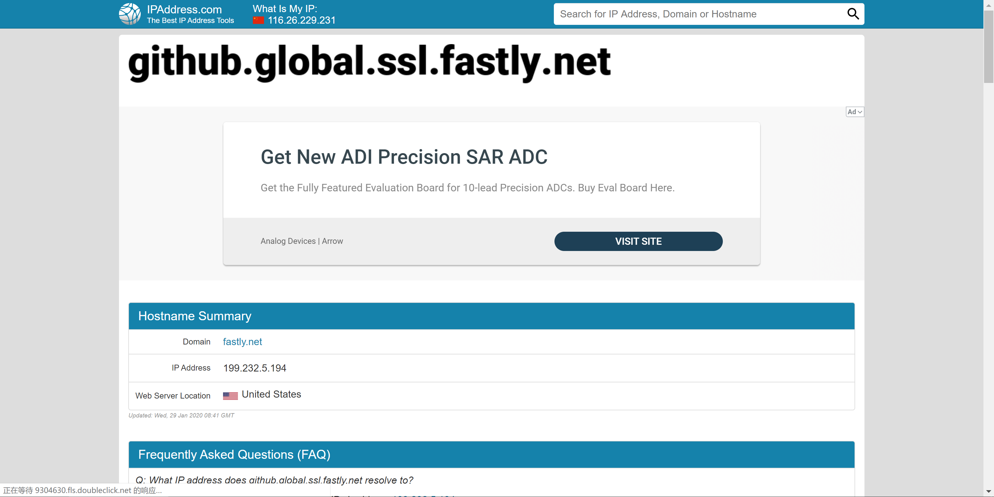 浏览器访问https://www.ipaddress.com/, 分别输入github.com和github.global.ssl.fastly.net以获取最合适的ip去访问这两个网站.