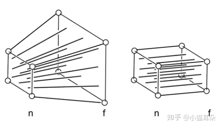 PS: 现代渲染流水线进行透视投影的算法是先把远平面进行压缩, 把视锥体压缩成一个长方体, 然后再通过正交投影矩阵变换到中心位于原点的边长为2的立方体$[-1, 1] \times [-1, 1] \times [-1, 1]$中, 如下图所示. 目前我还不大明白这个算法为何要将透视投影转化为正交投影的原因(直接利用把在近平面上的截影不香么……), 有待后续研究.