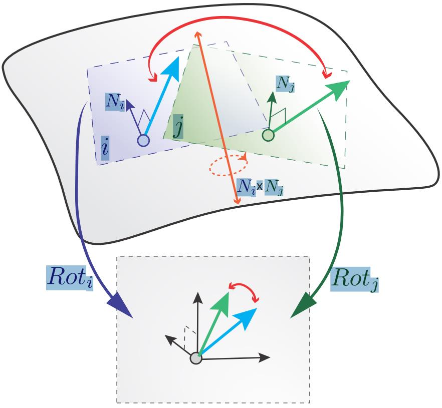 这样一来, 参数化便可以采用LSCM的思路去做, 可以构造出下述能量函数:$$E(u,L)=\sum_{t}A_t||J_t-L_t||^2_F,$$其中$L_t$为目标Transform矩阵, 当要求Isometric Mapping时, $L_t$为一个旋转矩阵; 而当要求Conformal Mapping时, $L_t$则为一个相似矩阵.