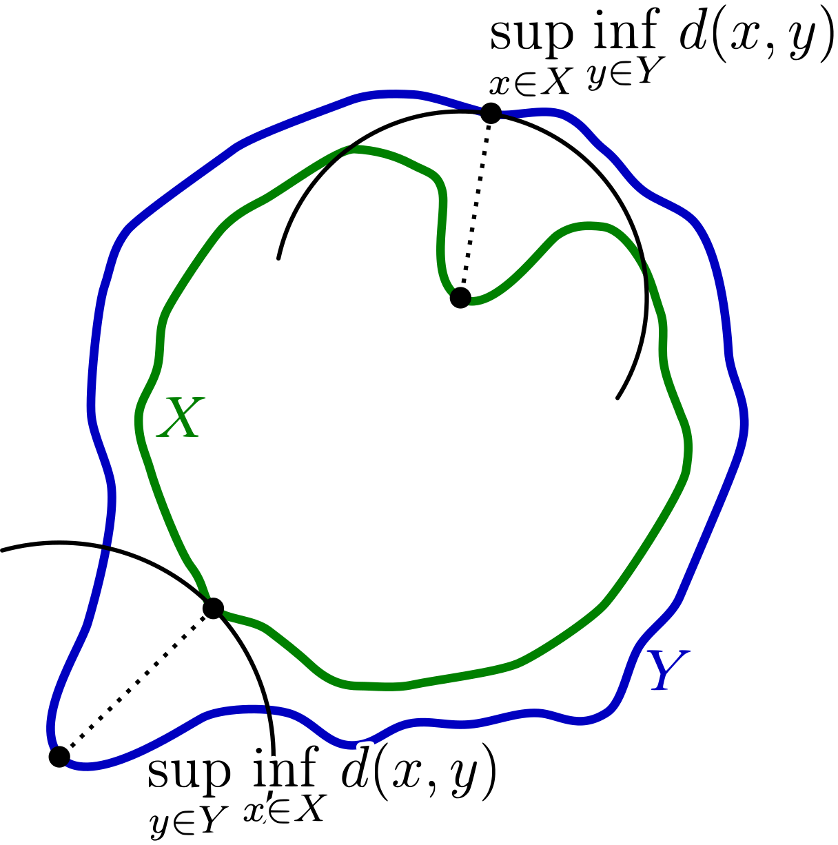 Hausdorff距离 令$X, Y$是度量空间$(M,d)$的两个非空子集. 我们定义Hausdorff距离$d_H(X, Y)$为$$d_H(X, Y) = max\{ \sup_{x \in X} \inf_{y \in Y} d(x, y), \sup_{y \in Y} \inf_{x \in X} d(x, y) \}.$$一般来说, $\sup_{x \in X} \inf_{y \in Y} d(x, y) \ne \sup_{y \in Y} \inf_{x \in X} d(x, y),$ 如下图所示.