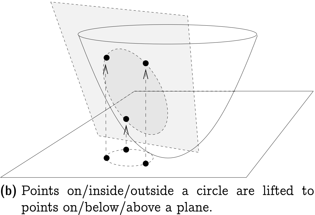 关于Lifting Map的一个重要引理为: 设$C$是平面上的一个圆, 经提升后$l(C) = \{ l(p) | p \in C \}$位于一个唯一的平面$h(C) \subset R^3$上. 此外, 任一点$p \in R^2$在圆$C$内(外) 当且仅当点$p$经提升后得到的点$l(p)$在平面$h(C)$下(上), 如下图所示.
