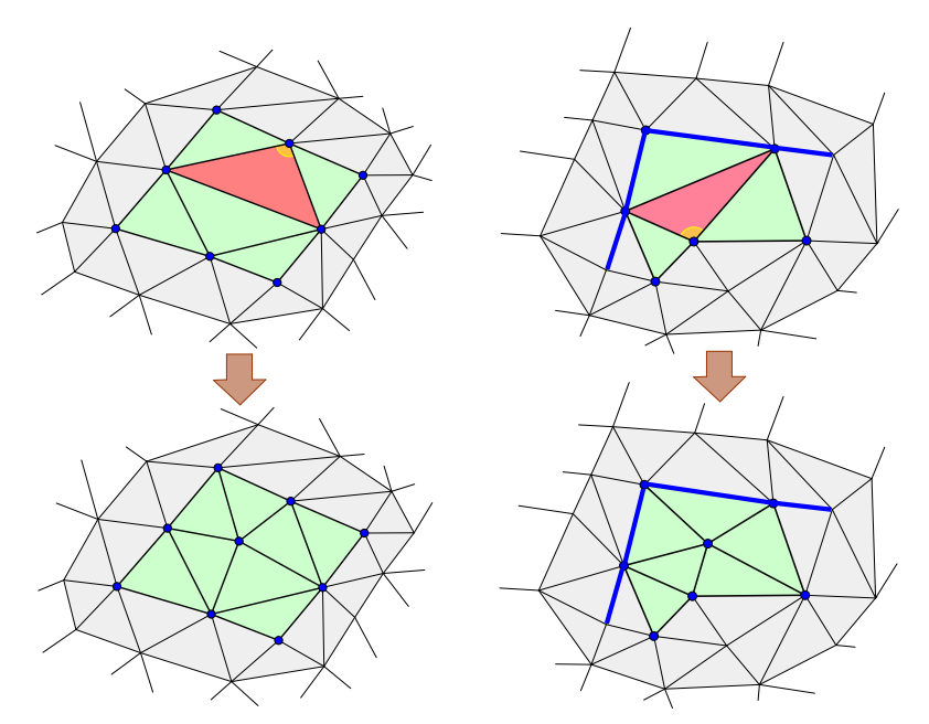 $\cdot$ 更新三角剖分. 遍历所有边, 对不满足空圆特性的边执行Flip操作.