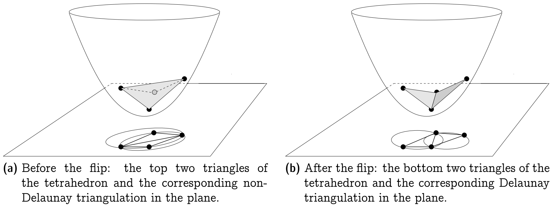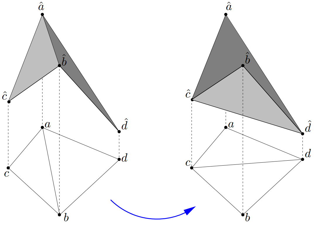 $\cdot$ Termination. 从几何上看, Lawson Flip算法可以解释为将一个四面体中最上面的两个三角形替换为最下面的两个三角形的操作, 可结合上述引理与下图理解.