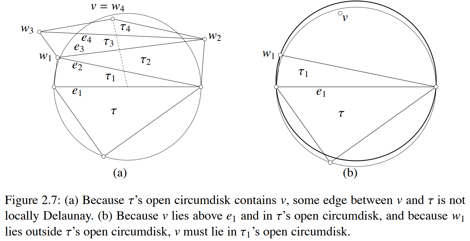 由于三角形$\tau, \tau_1$相邻, 由局部Delaunay三角剖分定义可知, $\tau_1$中与公共边相对的顶点$w_1$必定落在$\tau$的外接圆外部. 再看相邻的两个三角形$\tau_1, \tau_2$, 由局部Delaunay三角剖分定义可知, $\tau_2$中与公共边相对的顶点$w_2$必定落在$\tau_1$的外接圆外部, 从而落在$\tau$的外接圆外部, 如上图(b)中所示…… 类似可推得, $\tau_n$中的顶点$w_n$也必落在$\tau$的外接圆外部, 而这与假设矛盾, 故命题得证.
