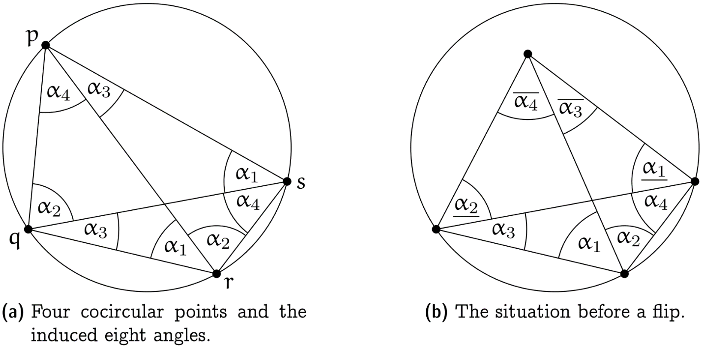 $\cdot$ Flip前两个三角形的六个内角分别为$\alpha_1 + \alpha_2, \alpha_3, \alpha_4, \underline{\alpha_1}, \underline{\alpha_2}, \overline{\alpha_3} + \overline{\alpha_4}$.