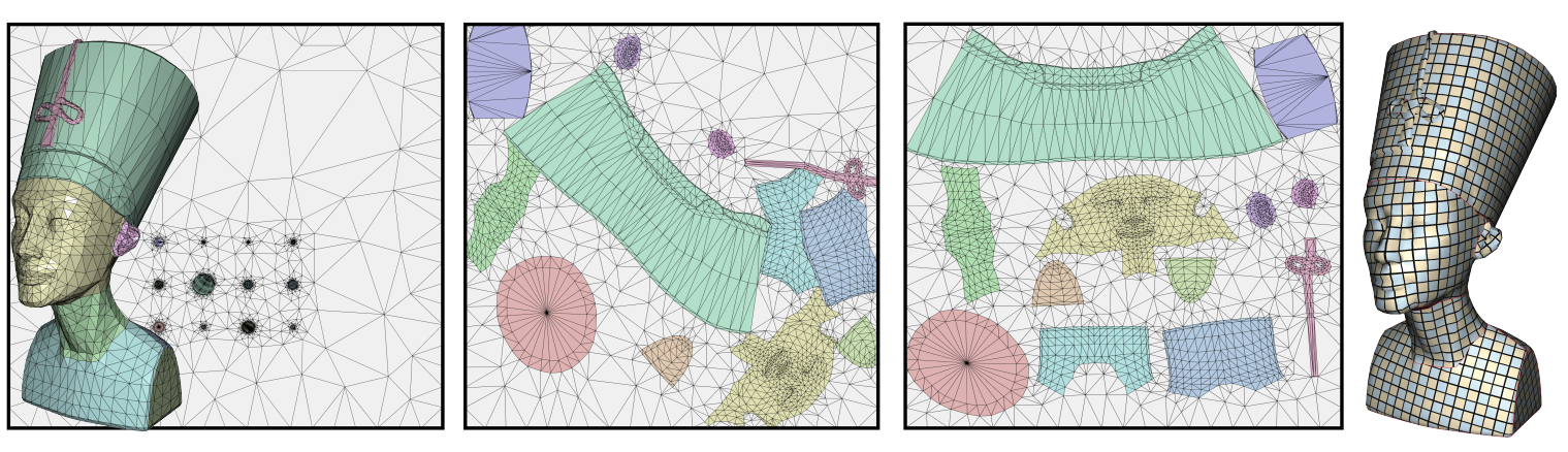 又称Flattening或者Unfolding, 本质上就是一个映射, 主要分为Flip-Free, Locally Bijective和Bijective三种, 其条件的严格程度是从前往后层层递进的. 其中, Flip-Free的参数化算法仅要求得到的三角网格没有翻转的三角形; Locally Bijective的参数化算法不仅仅要求没有翻转的三角形, 还要求对于原始网格的边界点而言, 其1-Ring区域映射到2D平面上以后无相交的边界边; Bijective的参数化算法则要求最为严格, 直观上可以理解为Bijective = Flip-Free + Locally Bijective, 要求原始网格上的每个点都和参数化后得到的网格上的每一个点存在双射. 参数化是一个非常基础的图形学工具, 应用非常广泛, 如Texture Mapping, Normal Map, Remeshing, suface mapping, Mesh Generation等.