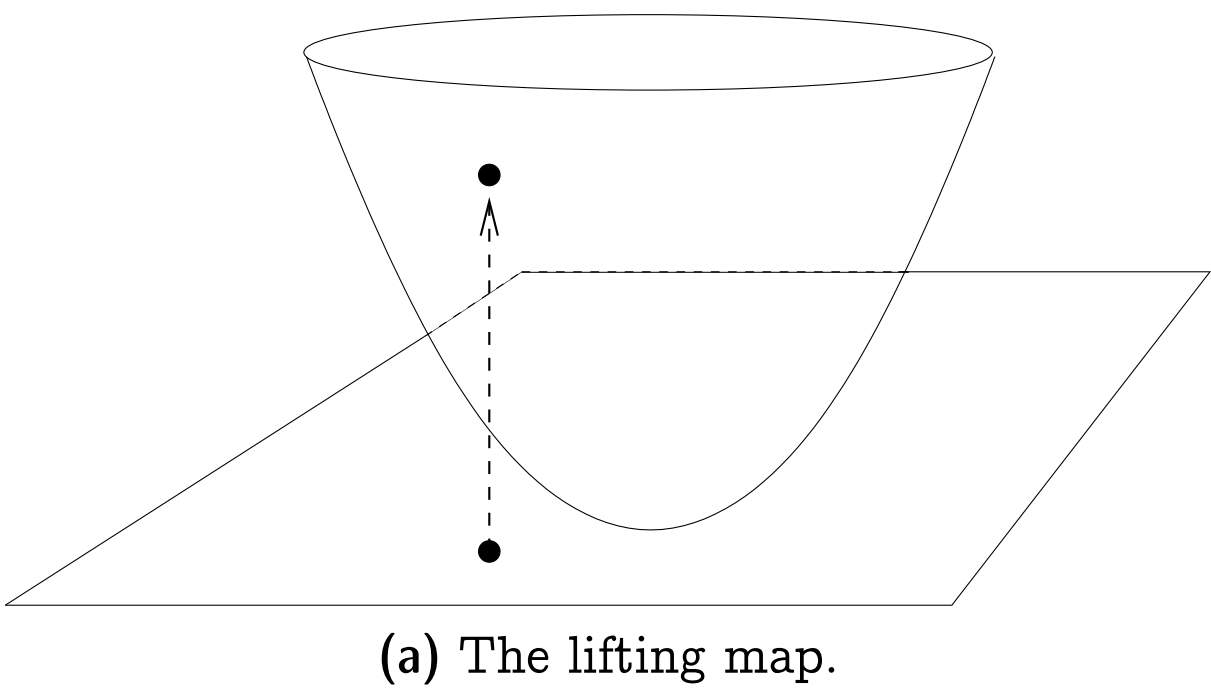 证明前需要先引入The Lifting Map的概念: 给定点$p = (x, y) \in R^2$, 其提升$l(p)$为点$l(p) = (x, y, x^2 + y^2) \in R^3$. 从几何上来看, $l$将点竖直提升到一个单位抛物面上, 如下图所示.