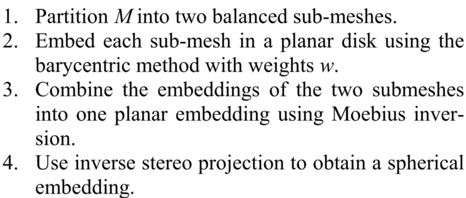 $\cdot$ Tutte’s Barycentric Mapping能够从理论上保证参数化结果是Bijective的, 算法的主要思路是先把边界点映射到一个凸多边形的边界上, 然后内部点是其邻居点的凸组合, 这样便可以通过求解一个线性系统来实现Bijective的参数化, 然而实际上由于数值精度的影响, 算法结果容易出现退化的三角形.