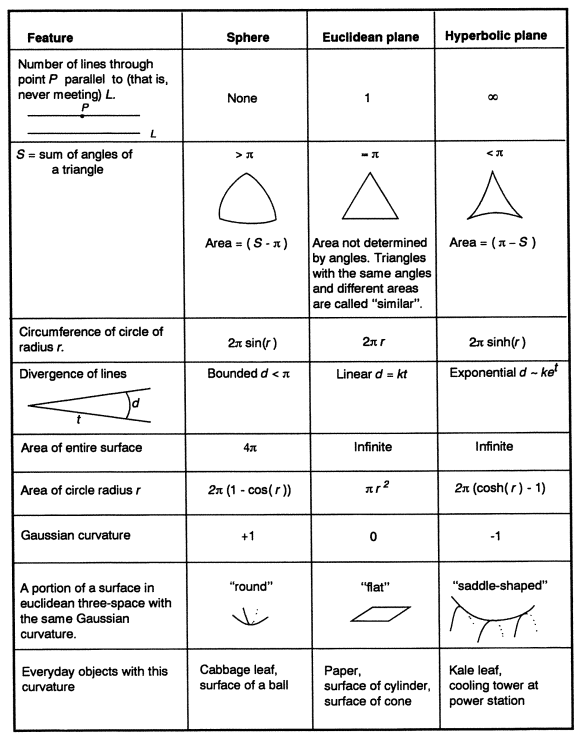 球面, 欧几里得平面与双曲平面是三种常见的几何模型, 下图总结了这三种几何模型的特点.