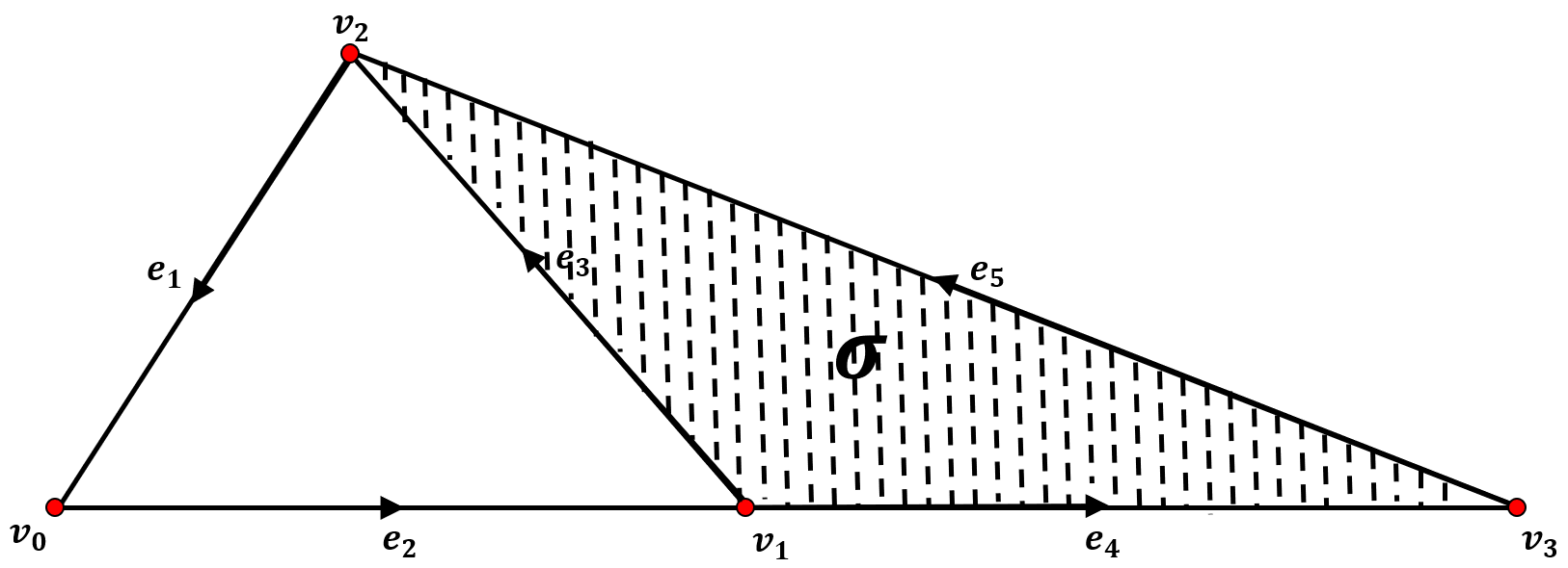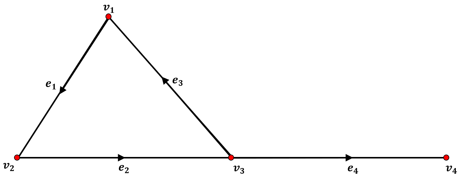 解: 由于有限单纯复形$K$含4个点, 4条边, 故$$C_0(K) \cong \mathbb{Z}^4, n_0 = 4, \\ C_1(K) \cong \mathbb{Z}^4, n_1 = 4.$$从而, 我们有$\partial_1(e_1) = v_2 – v_1$(在域$\mathbb{Z}$中进行计算, 若在域$\mathbb{Z}_2$中进行计算, 则其结果为$v_2 + v_1$), 同理可得$$\partial_1(e_2) = v_1 – v_3, \\ \partial_1(e_3) = v_3 – v_2, \\ \partial_1(e_4) = v_4 – v_3.$$又$\partial_1(e_1 + e_2 + e_3) = 0$, $Ker \partial_1 \cong \mathbb{Z}$, $$Im \partial_1 = \left \langle v_2 – v_1, v_1 – v_3, v_3 – v_2, v_4 – v_3 \right \rangle \\ = \left \langle v_2 – v_1, v_1 – v_3, v_4 – v_3 \right \rangle \cong \mathbb{Z}^3,$$从而$z_1 = 1$, $b_0 = 3$. 从直观上来讲, 我们需要”取走” $z_1$条边(如$e_1$) 才能破圈(即得到一棵最小生成树), 除去公共点(如$v_3$), 剩下$b_0$条边(如$e_2, e_3$与$e_4$) 恰好对应$b_0$个0维单形(如$v_1, v_2$与$v_4$).
