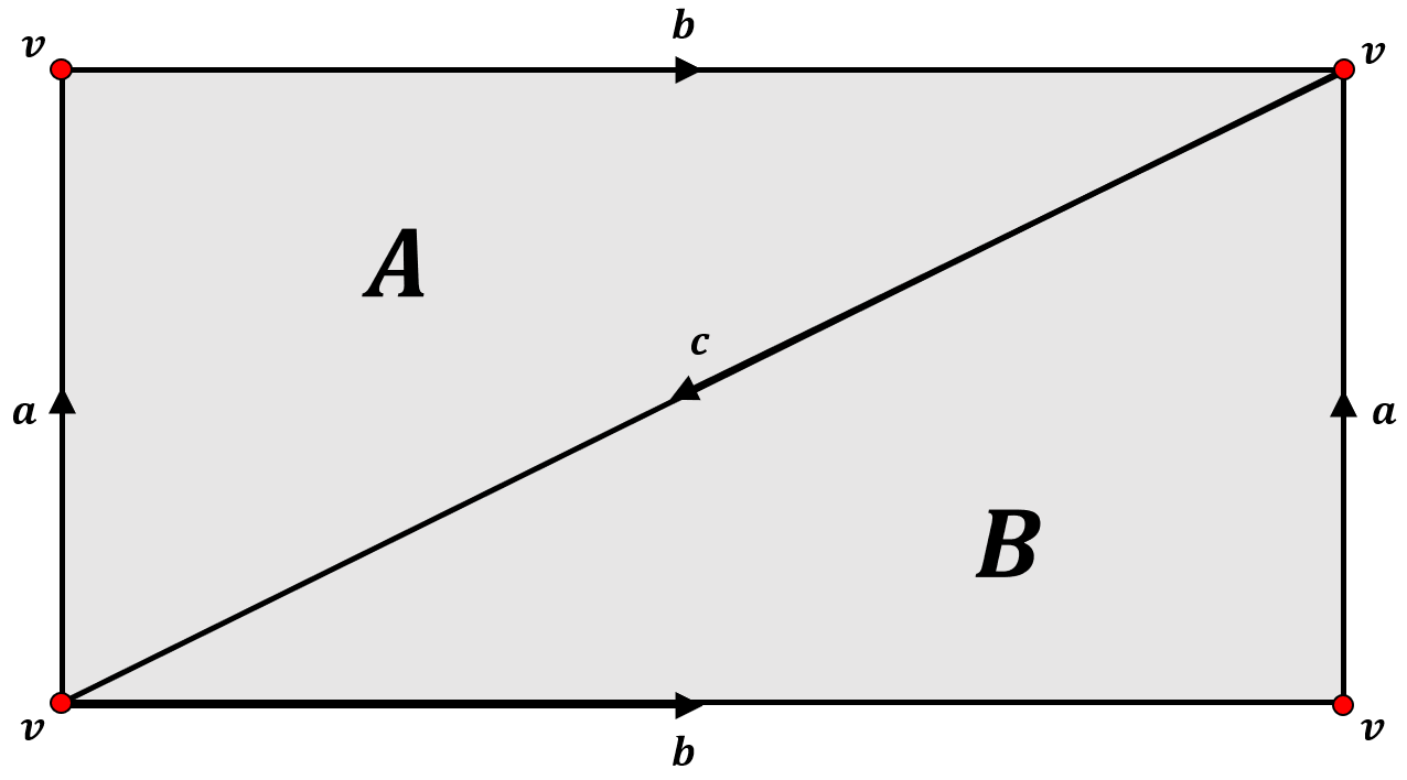 例3 考虑$K$为环面. 已知$H_0(K ; \mathbb{Z}_2) \cong \mathbb{Z}_2$, $H_1(K ; \mathbb{Z}_2) \cong \mathbb{Z}_2^2$, $H_2 $$ (K ; \mathbb{Z}_2) = $$ \mathbb{Z}_2$. 所以$\beta_0(K) = 1$, $\beta_1(K) = 2$, $\beta_2(K) = 1$. 如下图所示. 容易算出$$C_0(K) = \left \langle v \right \rangle \cong \mathbb{Z}_2, \\ C_1(K) = \left \langle a, b, c \right \rangle \cong \mathbb{Z}_2^3, \\ C_2(K) = \left \langle A, B \right \rangle \cong \mathbb{Z}_2^2.$$