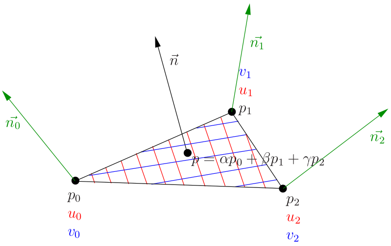 对于一个三角形的每个顶点, 我们已知其坐标$p$, 纹理坐标$uv$与法线. 对于待渲染的当前像素, 软光栅器给出了其重心坐标($\alpha, \beta, \gamma$). 这意味着三角形内任一点的坐标$p$均可以由$p = \alpha p_0 + \beta p_1 + \gamma p_2$得到. 同理可得:$$ u = \alpha u_0 + \beta u_1 + \gamma u_2, \\ v = \alpha v_0 + \beta v_1 + \gamma v_2, \\ \vec{n} = \alpha \vec{n}_0 + \beta \vec{n}_1 + \gamma \vec{n}_2.$$而以$UV$空间中的$U$轴与$V$轴为两个坐标轴, 即可构造出切线空间.