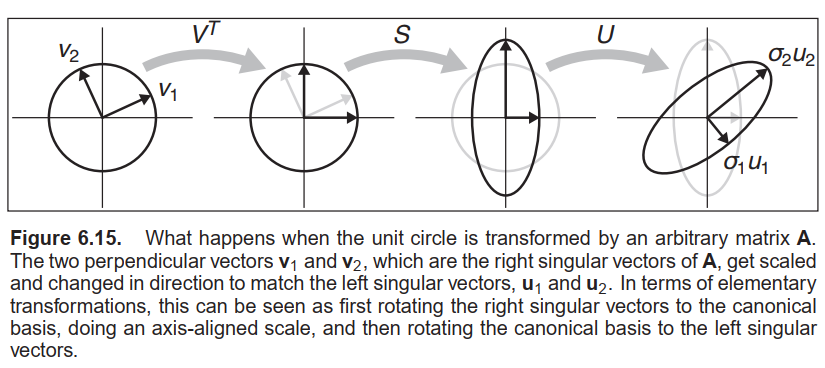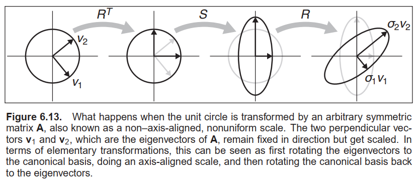 $\\$从几何上来看, 我们可以将正交矩阵$\mathbf{R}$视为旋转变换, 将对角矩阵$\mathbf{S}$视为缩放变换, 因此这是一个多步的几何变换: