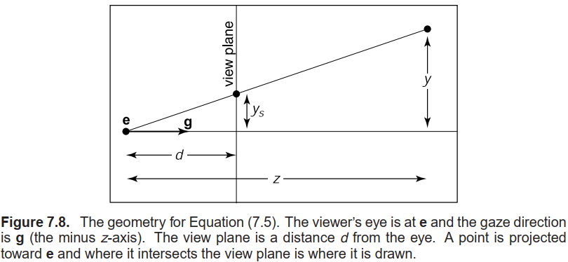 1维透视投影的关键特点是, 屏幕上物体的大小与其$z$分量的倒数$1/z$成正比, 如下所示:$$y_s = \frac{d}{z}y,$$其中, 各符号的定义如下图所示.