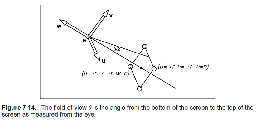 $\theta$有时亦被称为竖直方向上的FOV, 以区别于左右两边的夹角或对角之间的夹角. 从图中我们可以看到$$tan \frac{\theta}{2} = \frac{t}{|n|}.$$若$n$与竖直方向上的FOV $\theta$是确定的, 那么我们可得$t$. 一般来说, $n$的值是固定的, 如此一来, 定义窗口的自由度也便少了一个.