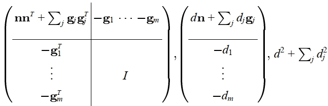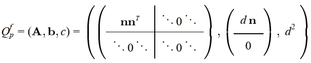\end{pmatrix}.$$因为$Q^f_{s_j}(\mathbf{v}) = (\widehat{s}_j(\mathbf{p}) – s_j)^2 = (\mathbf{g}^T_j \mathbf{p} + d_j – s_j)^2$, 通过代数重排可得$Q^f_{s_j} = $$ (\mathbf{A}, \mathbf{b}, c) = $