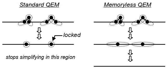 相比之下, 在使用占用内存更少的减面算法的情况下, $Q^v$是在算法执行过程中根据已简化的Mesh的几何形状与属性不断重新计算的. 这种忘记更精细的细节的能力允许在需要时进一步简化.