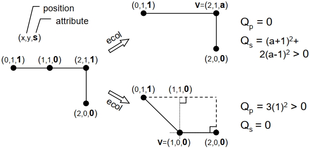 在上图右上角中, 边塌缩后几何体体积将完全保持($Q_p = 0$), 但属性误差$Q_s$不为0. 原因是顶点$\mathbf{v} =(2, 1, \mathbf{a})$的属性值$\mathbf{a}$不能同时在所有3个原始线段上插值属性梯度. 特别地, 必须将$\mathbf{a}$设置为$\mathbf{-1}$来外插最左侧的段线段$[(0, 1, \mathbf{1}), (1, 1, \mathbf{0})]$.