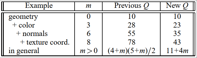 $\\$ 二次误差度量$Q^f(\mathbf{v})$由一个$(3 + m) \times (3 + m)$矩阵$\mathbf{A}$, 一个$3 + m$维列向量$\mathbf{b}$与一个标量$c$组成. 由于由上述公式得到的矩阵$\mathbf{A}$是稠密的实对称矩阵, 故$Q$的存储需要共计$$(1 + (3 + m))(3 + m) / 2 + (3 + m) + 1 = (4 + m)(5 + m) / 2$$个系数, 即系数数量是一个关于$m$的二次函数.