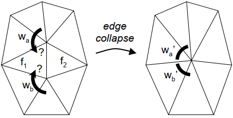 $\\$ 对于边塌缩, 必须重新定义楔合并后其二次误差度量的合并策略(类似于$Q^v(\mathbf{v}) $$ = Q^{v_1}(\mathbf{v}) + Q^{v_2}(\mathbf{v})$). 参见下图, 若$w_a$与$w_b$在边坍塌前均与面$f_1$相邻, 则在边坍塌后$w_a$与$w_b$相邻, 并重新记为$w_a’$与$w_b’$, 同样地, 在面$f_2$的另一侧亦是如此.