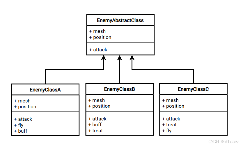 从上面的UML图可以看出, EnemyClassA可以飞, 可以上buff, EnemyClassB可以上buff, 可以治疗队友, EnemyClassC可以治疗队友, 可以飞. 想象一下, 如果再有一个新的方法, 比如可以隐身, 那么可能又会产生三个新的基类(考虑两种独有的方法), 但其实完全不必要, 因为fly, buff, treat明显是重复实现了好多次.